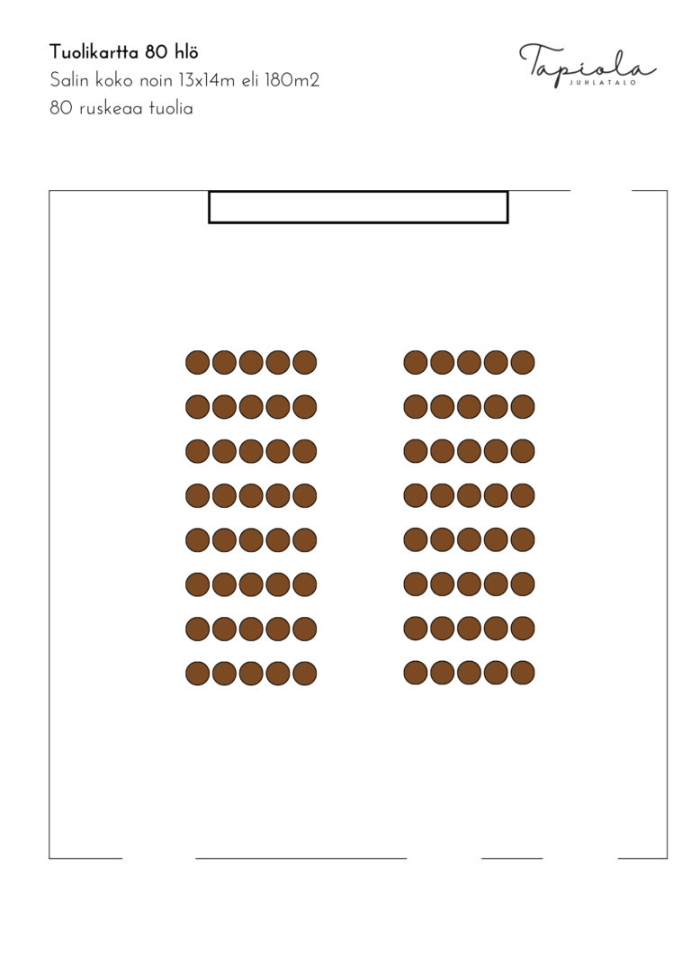 Sali vuokrataan tyhjänä ja erilaisia katsomoita varten tuoleja on yhteens 149 kappaletta. Ruskeita muovituoleja on kahdenlaisia, toisia 85 kpl ja toisia 17 kpl. Oransseja muovituoleja löytyy 47 kappaletta. Näistä saat muodostettua eri kokoisia katsomoita saliin. Muista myös mahdolliset esteettömien vieraiden paikat! Tuolit löytyvät pinosta tuolivarastostamme salin oikeasta reunasta. Voit valita joko laittaa itse tuolit paikoilleen ja pois, tai tilata tuolien laiton meiltä lisäpalveluna 75€/ suunta.